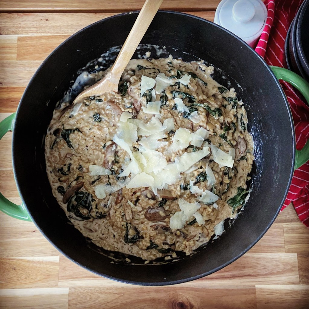 - Add broth, 1 cup at a time, and cook, stirring often, until it is mostly absorbed between additions. Rice should have an al dente texture when finished. When adding the last cup of broth, add the mushrooms, kale, thyme, cheese, heavy cream and the remaining 1 tablespoon of butter. Cook, stirring, until the risotto is creamy. Season with salt and pepper, if necessary. Serve with freshly grated parmesan cheese.