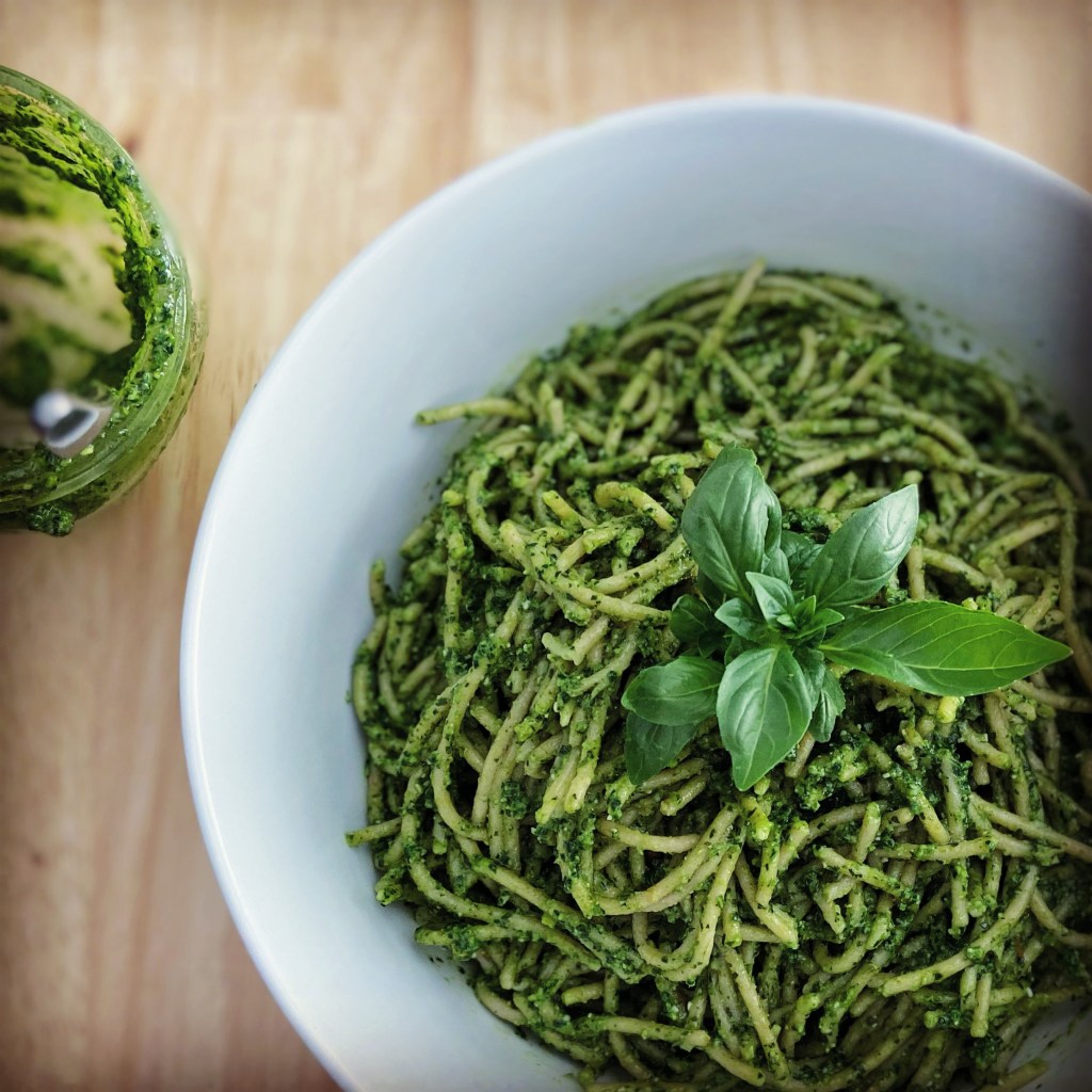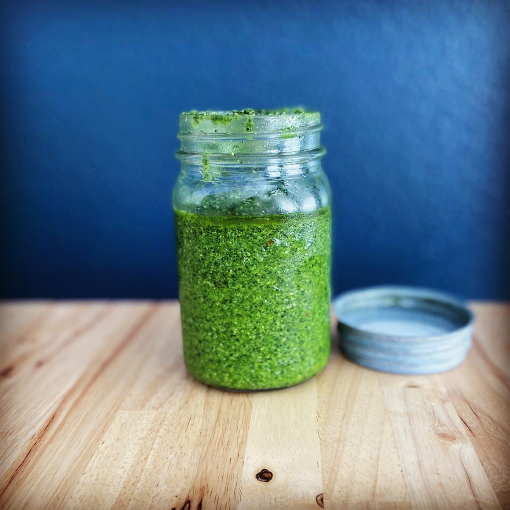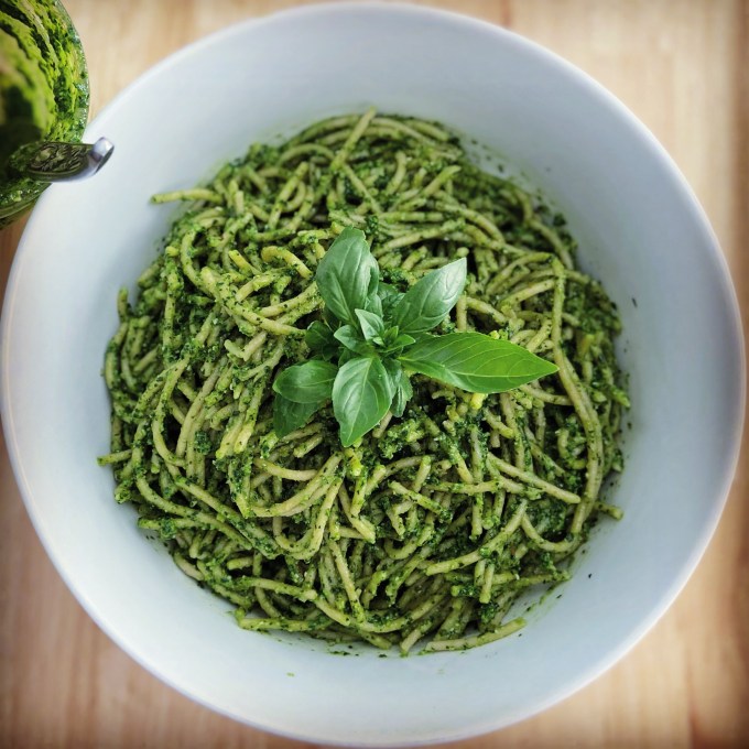 I’m not someone who overly cares about the health content of the food she puts in her mouth. I have no problem eating pizza, burgers, fettucine alfredo or ice cream without any guilt. But I do enjoy foods that are both healthy and taste good, and this recipe fits the bill. This pesto sauce is chock full of superfoods and something you can feel good about eating (or overeating!). So let’s discuss some of the superfood ingredients in this sauce: