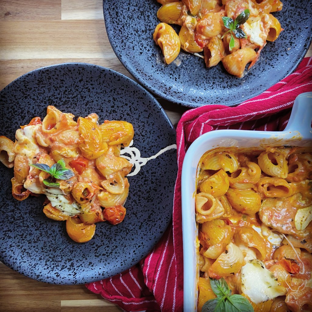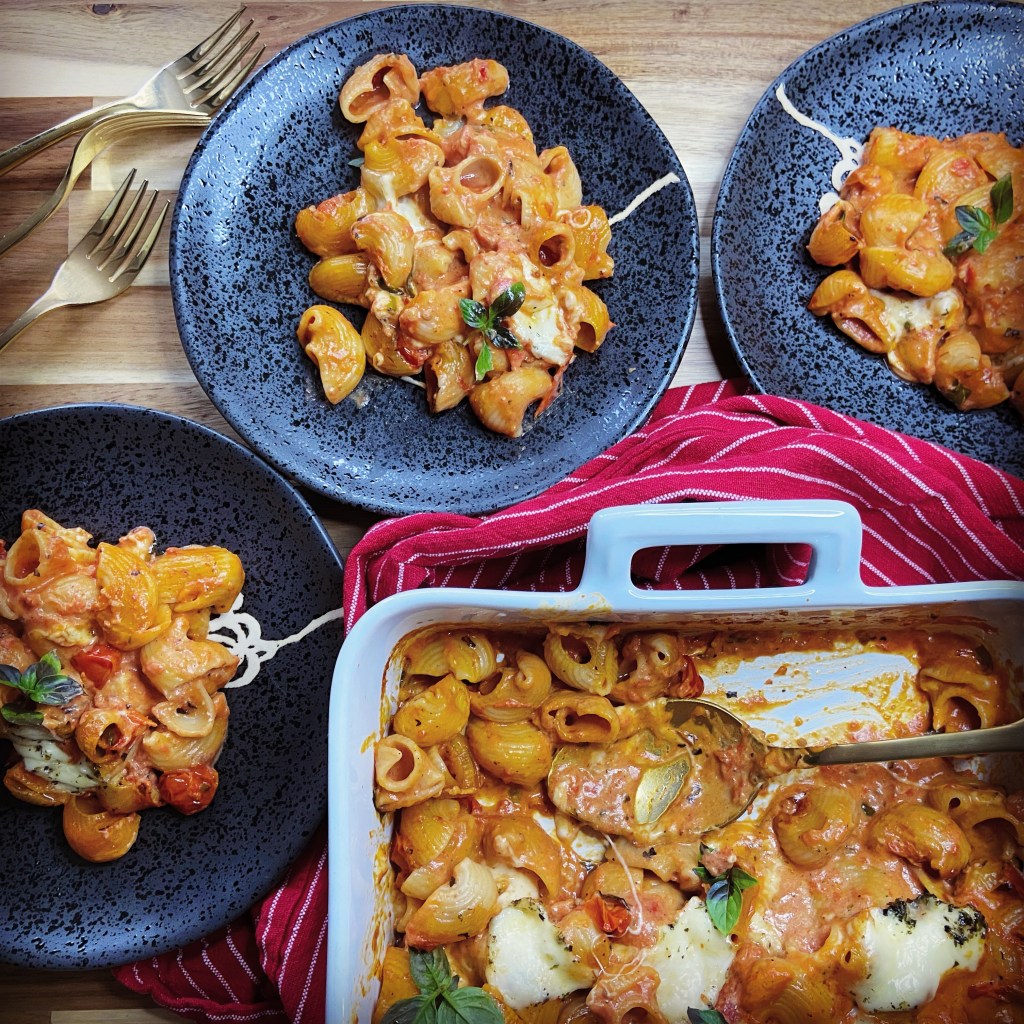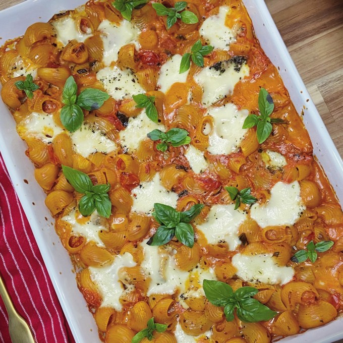 This dish is really flexible. You could (probably) omit the cream and make more sauce and/or use more pasta water. You could add cheese to the pasta while mixing all of the ingredients before pouring into the baking dish. Lots of recipes I spotted either called for shredded mozzarella or parmesan cheese. You could go hog wild and use both. I used two handfuls of basil but you could add more. Or you could add other herbs (but then it wouldn’t be all that caprese-y, maybe). You could add chicken or Italian sausage if you would like some protein. If you like spice, you could bump up the heat with plenty of red chili flakes. You could douse the dish in a ton of fresh mozzarella and broil it for the last few minutes to get a crusty top.