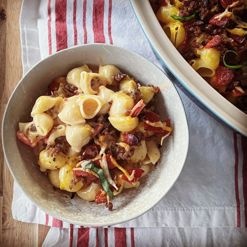 So I cobbled together my own pizza mac recipe by taking an easy stove-top version and making it over the top by piling pizza ingredients inside and out – minus the pizza sauce. I still wanted it to be mac and cheesy, not drowning in tomato flavor. With my first try I felt like I hit it out of the ball park on flavor and ingredients but didn’t exactly love the way I had assembled the mac dish for baking and immediately thought of different variations anyone could incorporate (i.e. different pizza toppings, pizza seasoning, etc.) to please their own palate.