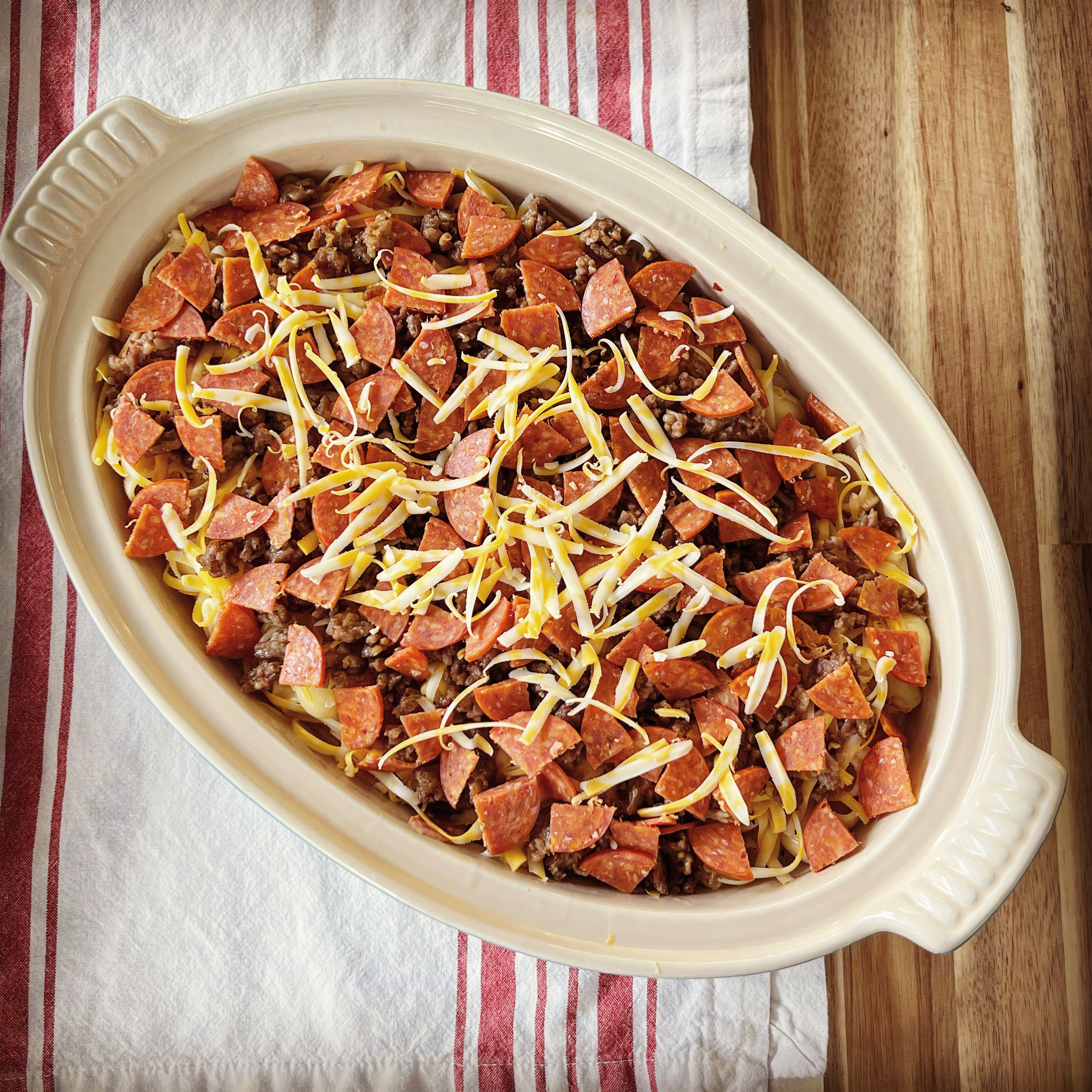 - Pour into a 3-quart cooking dish and top with additional shredded cheese and the remaining Italian sausage and pepperoni. Bake for 30 to 40 minutes in the bottom third of the oven. Remove from oven and garnish with some basil chiffonade if you have basil on hand.
