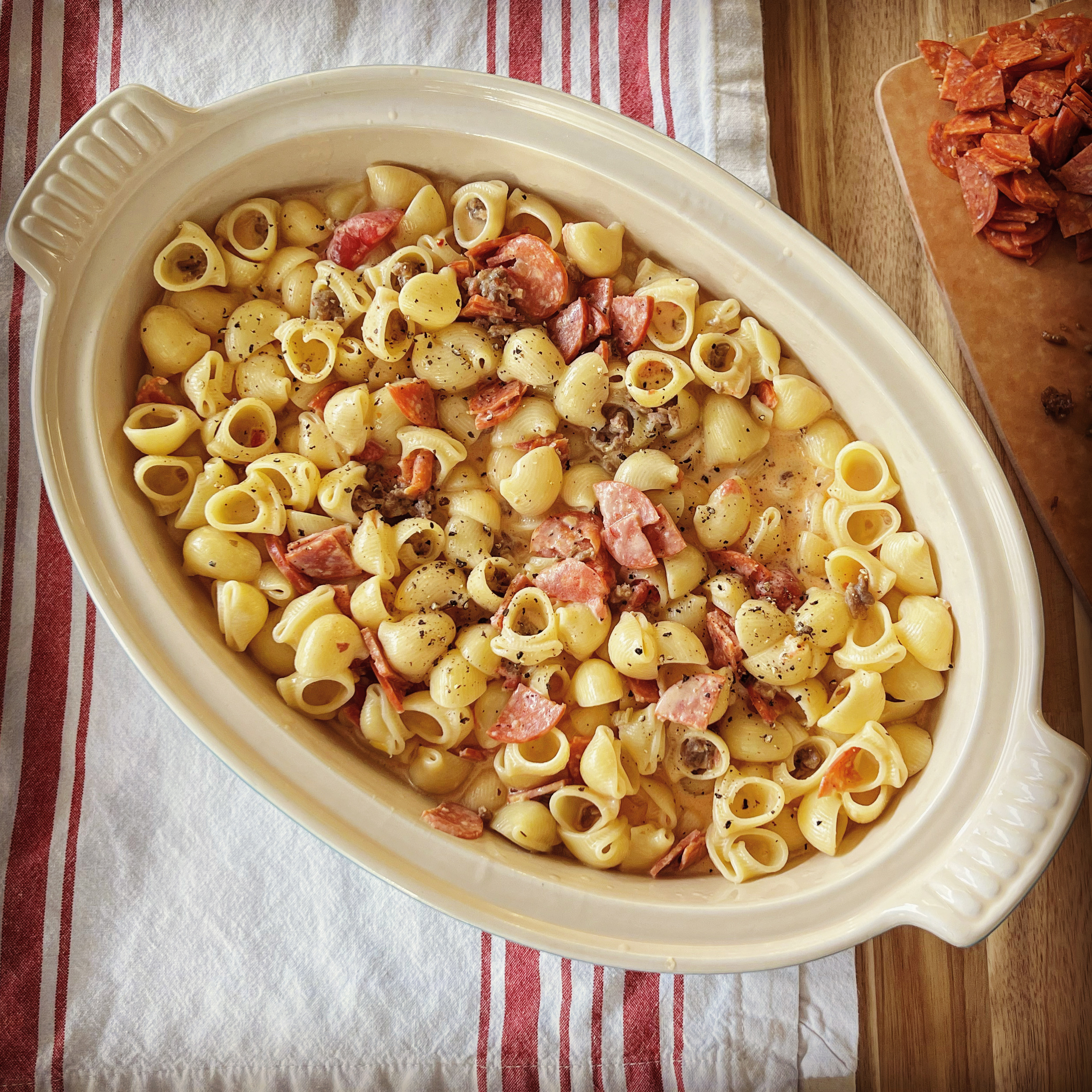 - Stir the cooked pasta with the cheese sauce, stewed tomatoes in their juices and some pasta water (I poured the pasta water into the empty stewed tomato can and found that amount to be perfect even though it looked alarmingly watery at first). Add about 2/3 of the cooked sausage and pepperoni to the pasta and stir to combine.