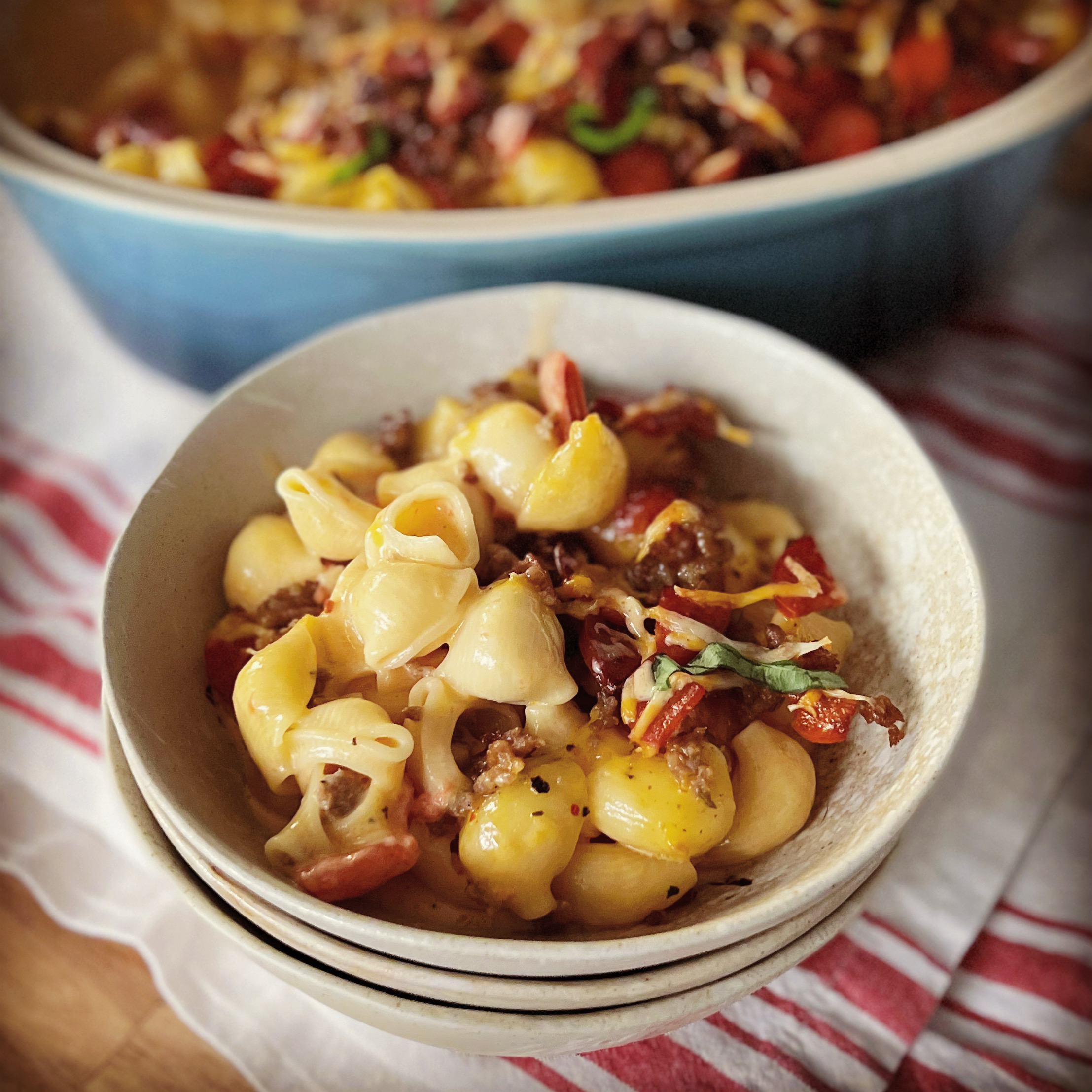 - Pour into a 3-quart cooking dish and top with additional shredded cheese and the remaining Italian sausage and pepperoni. Bake for 30 to 40 minutes in the bottom third of the oven. Remove from oven and garnish with some basil chiffonade if you have basil on hand.