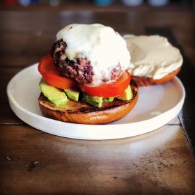 Turkey Burgers with White Cheddar Cheese, Sliced Avocado and Spicy Mayo